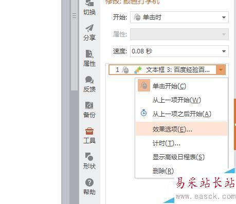 6、設置完速度后,如果播放時顏色不想要默認的,可以右擊該效果,選擇效果選項。