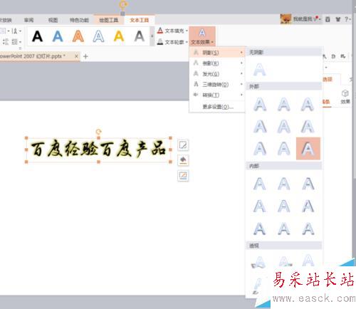 2、然后在文本框中輸入字體,完了之后點擊文本框,執行文本工具-文本效果,可以給文本字體設置不同效果。