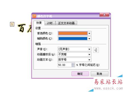 7、在彈出窗里點擊顏色,更改即可,然后點擊確定。然后點擊下方的播放,看下預覽效果,這樣就完成了。