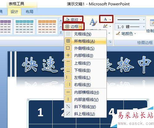 4、表格工具——設(shè)計(jì),底紋統(tǒng)一為一種顏色,我選了藍(lán)色;字體顏色統(tǒng)一為白色;邊框選所有框線。