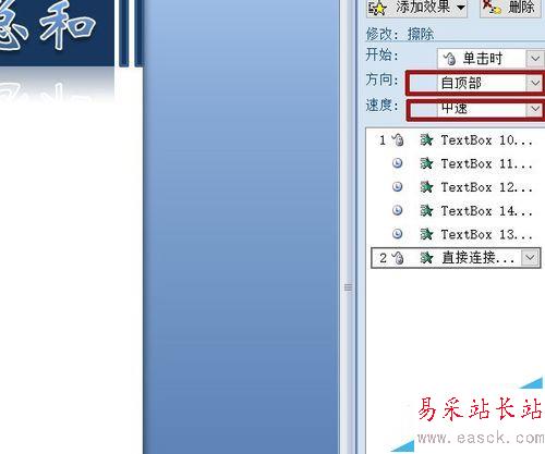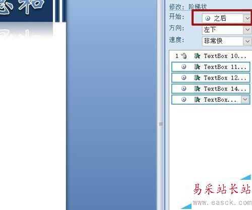 8、五個(gè)文本框全部選中,自定義動(dòng)畫面板中為它們添加效果,進(jìn)入——階梯狀,后四個(gè)在開始欄中選“之后”。方向、速度如圖。