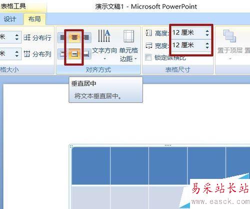 2、表格工具——布局,文本對(duì)齊方式居中,高度、寬度設(shè)置相同數(shù)值,使其為一個(gè)正方形表格。