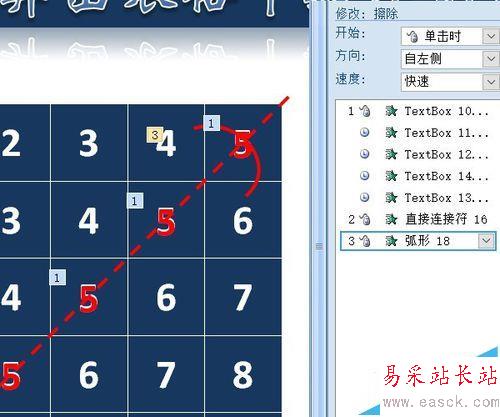 11、形狀工具中選擇弧形,在表格右側(cè)的4與6上畫出弧線,顏色紅色,粗細(xì)3磅。添加擦除動(dòng)畫,方向“自左側(cè)”,速度快速。
