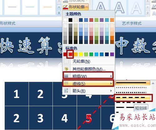 9、插入——形狀——直線,按住shift鍵在表格上如圖畫出一條對(duì)角線。形狀輪廓中將顏色設(shè)為紅色,線條粗細(xì)為3磅,虛線中選“短劃線”。