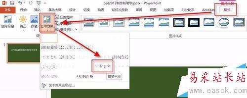 5、為文本圖片添加“蠟筆平滑”濾鏡藝術效果。步驟:選中文本圖片,點擊菜單欄中的格式選項卡,然后點擊藝術效果,最后選中“蠟筆平滑”,如下圖: