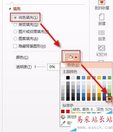 1、將PPT背景填充為深綠色或者墨綠色,我這里只是為了使背景顏色更加接近黑板的顏色。在空白ppt上單擊右鍵,選擇“設置背景格式(B)…”在右側彈出的設置背景格式對話中依次選擇“純色填充—>顏色—>綠色”,如下圖箭頭所示: