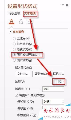 3、將文本填充效果設置為新聞紙填充。步驟:選中字體,在右側的設置形狀格式中點擊“文本選項”,接著選擇“圖片或紋理填充”,最后在紋理顏色框中選擇“新聞紙”效果,如下圖: