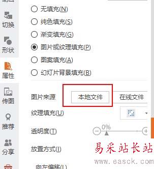 8、然后,選項“圖片或紋理填充”下的”本地文件“,選中要展示的圖片填入。