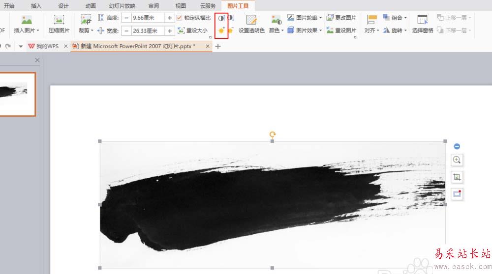 3、下載的筆刷圖片,還是其他來源的筆刷圖片,筆跡的邊緣或背景顏色都會偏灰色,要先去掉這些灰色,通過加強圖片亮度可以去掉。選中圖片在工具欄中“圖片工具”中有調節亮度的圖標,如圖所示