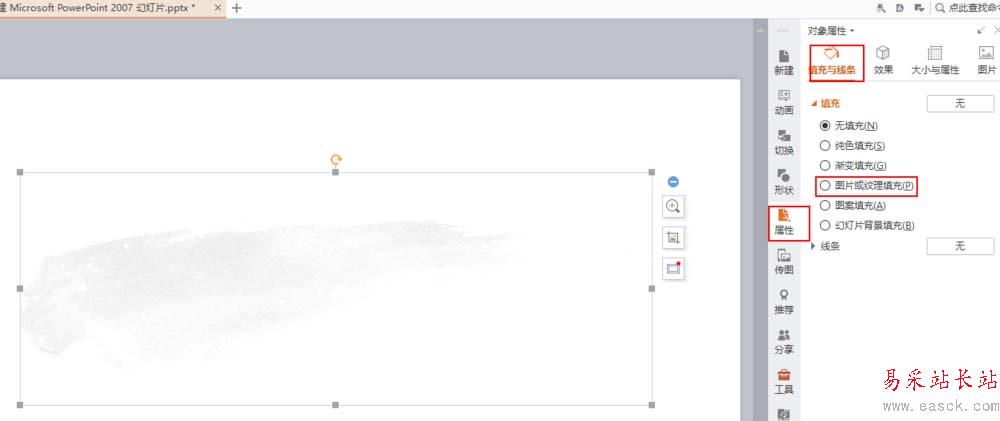 7、選中圖片,在右側選擇“屬性”—“填充與線條”—“填充”—“圖片或紋理填充”。