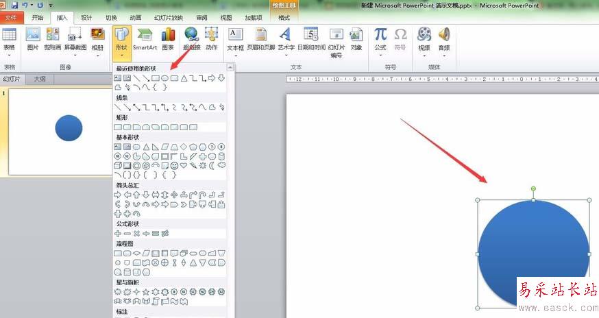 2、然后我們新建一個ppt,在ppt里點擊插入——形狀——橢圓,我們在ppt里畫一個圓球形如圖所示