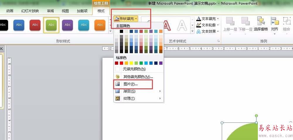 4、顏色填充好以后,我們點開形狀填充下拉菜單,然后填充內容選擇圖片,在彈出的對畫框中把之前下載好的圖片插入。