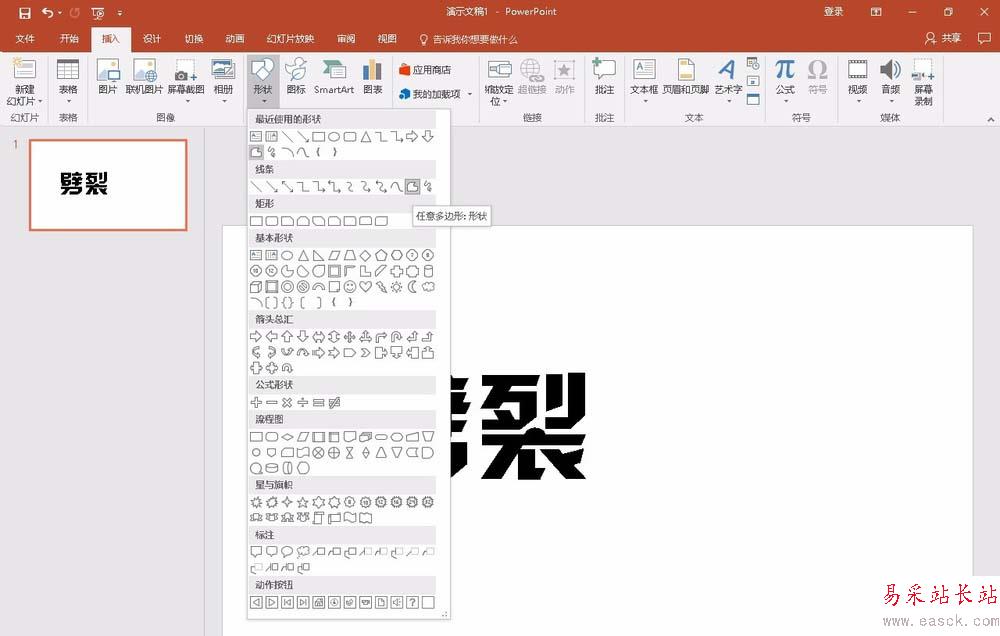 2、選擇【插入】菜單——形狀——任意多邊形:形狀。然后在編輯區(qū)繪制不規(guī)則形狀