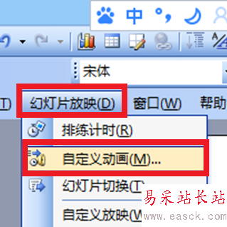 1、點(diǎn)擊上方工具欄中的“幻燈片放映”,在下拉框里選擇“自定義動(dòng)畫(huà)”,調(diào)出自定義動(dòng)畫(huà)工具欄。