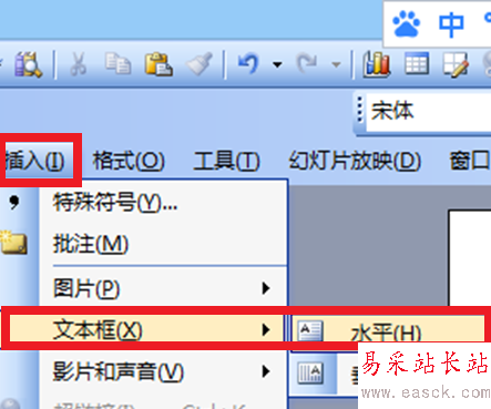 1、打開(kāi)空白ppt,點(diǎn)擊上方工具欄中的“插入——文本框——水平”,等到光標(biāo)變成十字形時(shí),按住鼠標(biāo)左鍵在ppt頁(yè)面上畫(huà)出文本框,然后,把光標(biāo)放到文本框內(nèi),切換輸入法,輸入文字即可。