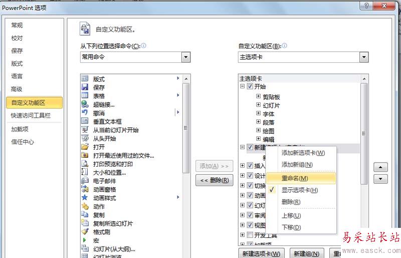 4、右鍵單擊該選項卡,從下拉菜單中選擇重命名,命名為“形狀”,同樣方法對新建組進行重命名為“形狀命令”。