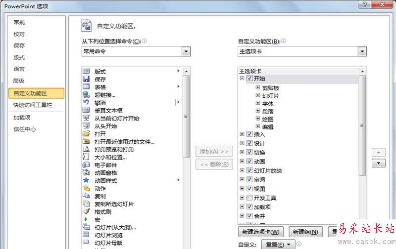 2、在彈出的PowerPoint選項中點擊自定義工具區,切換到該界面。