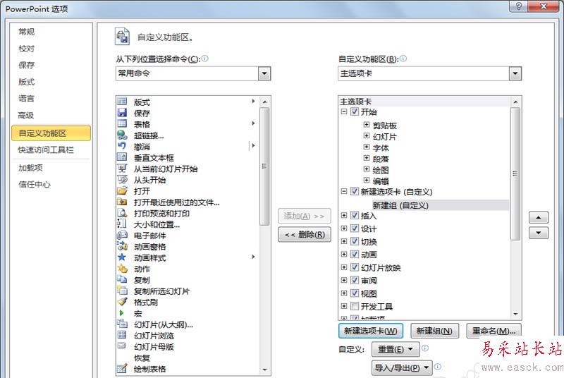 3、在自定義功能區的下方點擊新建選項卡按鈕,新建一個選項卡。