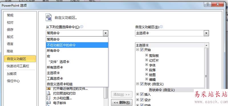我們在使用ppt2010時候,經常用到形狀相關的命令,可是在菜單欄里找不到,那么如何調出相關的命令呢?現在就把添加的過程和截圖分享出來,供大家參考使用。