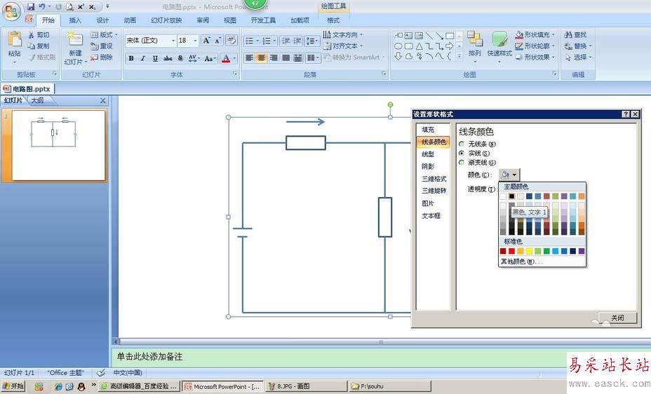 10、線條顏色也可以自行調(diào)整,比如黑色。按住圖形,右擊鼠標(biāo),點(diǎn)擊設(shè)置形狀格式,線條顏色,實(shí)線,主題顏色中找到黑色。