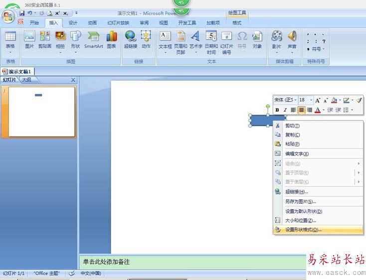 3、比如電阻。點(diǎn)擊長(zhǎng)方形,再點(diǎn)擊畫面,假如出現(xiàn)藍(lán)色陰影,鼠標(biāo)放在長(zhǎng)方形上,右擊鼠標(biāo)。出現(xiàn)設(shè)置形狀格式,點(diǎn)擊,之后點(diǎn)擊無(wú)填充,關(guān)閉。