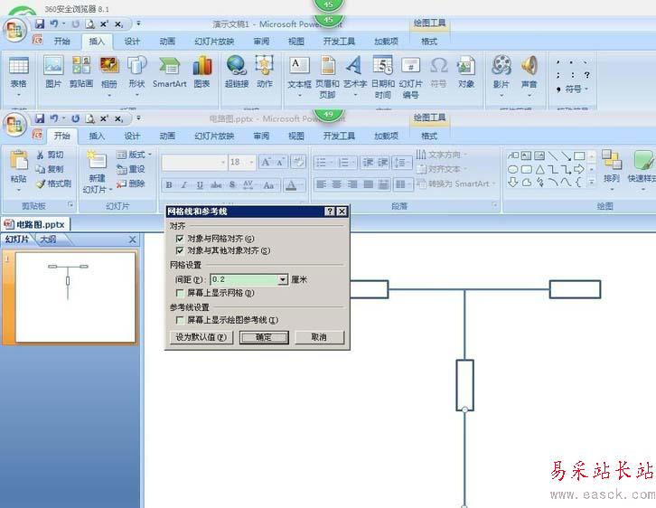 8、這時(shí)候,必須相繼點(diǎn)擊開始欄中的排列,對(duì)齊,網(wǎng)格設(shè)置。勾選對(duì)象與其它對(duì)象對(duì)齊之后,才可以自由組合直線和長(zhǎng)方形之類的圖形。根據(jù)你想要的電路,選擇對(duì)應(yīng)的圖形,通過(guò)不斷的復(fù)制,將它們連接在一起。
