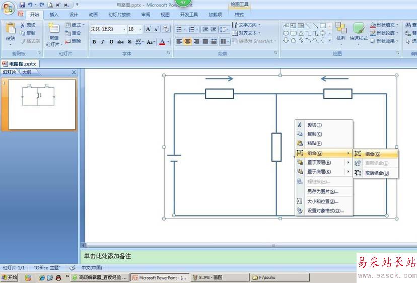 9、隨便點(diǎn)擊一個(gè)線條,然后按住Ctrl,點(diǎn)擊剩余的所有線條,右擊鼠標(biāo),點(diǎn)擊組合。所有的線路就合并在了一起。