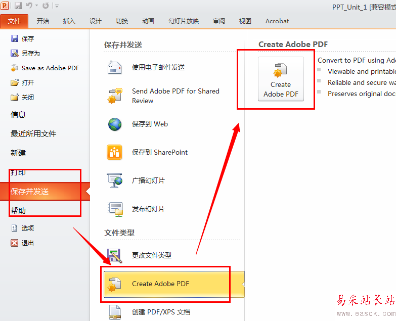 3、【文件】-【保存并發送】-【creat adobe pdf】,創建一個PDF文檔