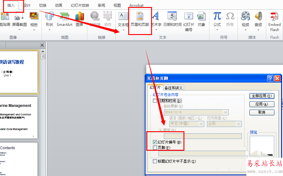 2、以office 2010為例。打開要打印的ppt,選擇【插入】-【頁眉和頁腳】,勾選【幻燈片編號】,這一步是為了后期打印出來之后方便閱讀,知道每張ppt的先后順序。