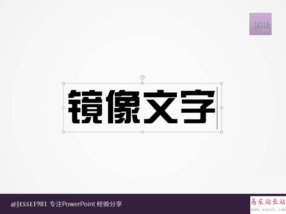 使用文字效果中的鏡像,并不能得到完整的鏡像,且鏡像只能垂直向下方。而左右鏡像文字,是指文字完全成鏡像展現,不光只是順序變為從右往左讀,就連筆畫結構都完全成鏡像。這在制作一些PPT封面時可以起到很強的裝飾作用。
