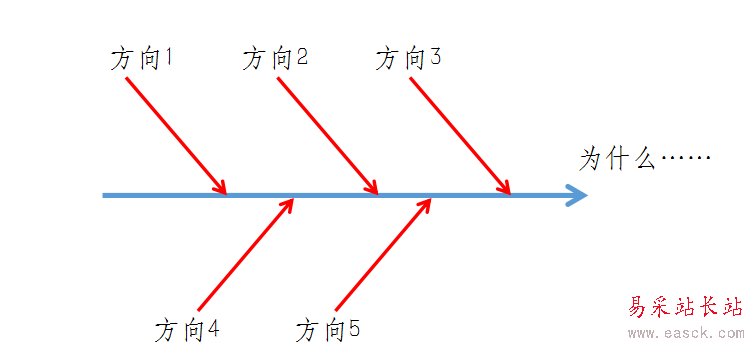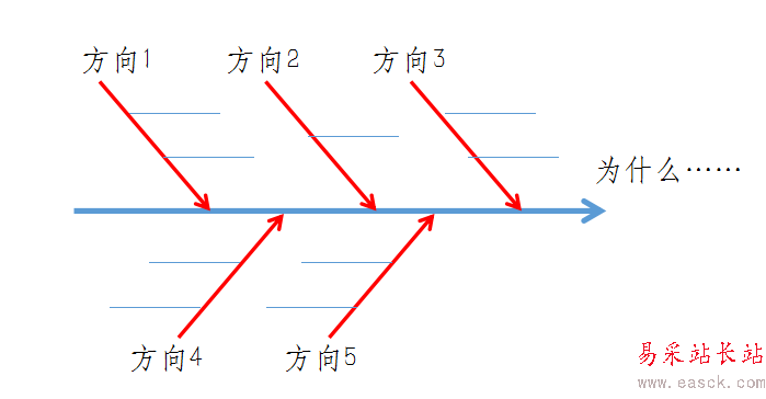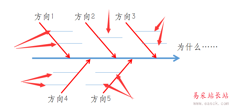 4、繪制分支。魚骨圖一般有若干分支,視你問題的復雜程度而定,就是從各個大方面去分析問題,在分析之前我們就需要確定這些方向。同樣是用插入箭頭的方式進行,注意把顏色調整一下和主干區分,最后就是利用文本框在末端加入你確定的方向。