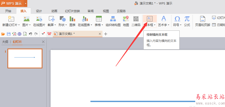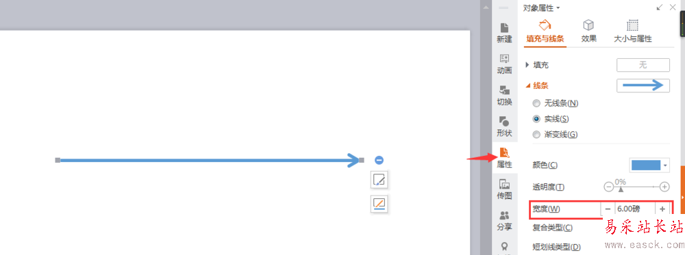 2、畫主干。魚骨圖有一個主干,我們點擊“插入-形狀”,在下拉菜單中找到“箭頭”圖形,插入一個箭頭,并調整到水平位置。我們可以打開它的屬性,調整它的寬度,使其變得更粗。