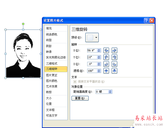6、切換到三維旋轉(zhuǎn)選項卡,設(shè)置透視為100%,旋轉(zhuǎn)x軸為59.9度,查看效果變化。