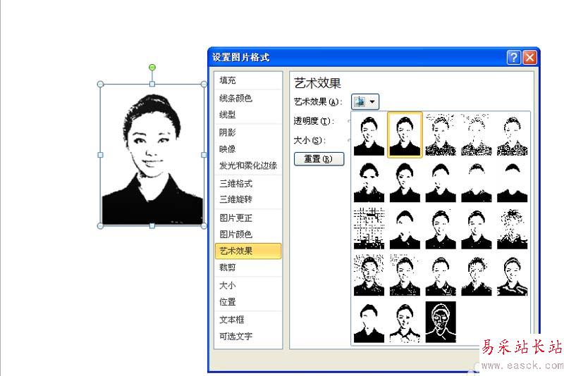7、切換到藝術(shù)效果選項卡,設(shè)置藝術(shù)效果為第一行第二個,并設(shè)置透明度為100%,大小為100.