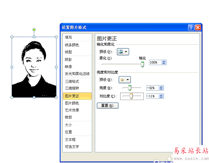 5、接著切換到圖片更正選項中,設(shè)置柔化為100%,亮度為-32%,對比度設(shè)置為-11%。