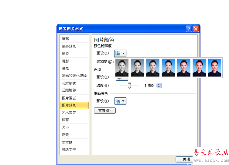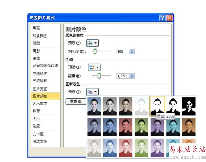 3、在圖片格式對話框中切換到圖片顏色選項,在顏色飽和度預(yù)設(shè)中選擇第一個,飽和度設(shè)置為30%。