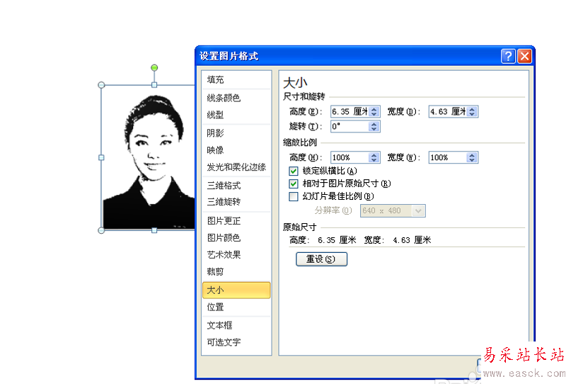 8、切換到大小選項卡,在該選項卡中可以根據(jù)自己的實際需要設(shè)置圖像的大小。