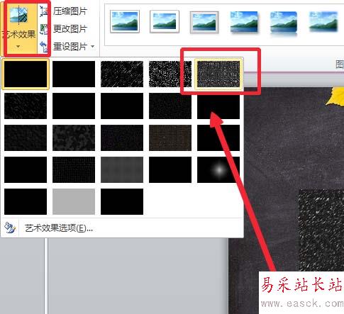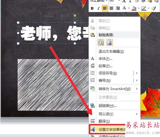 9、復制做好的粉筆效果圖片,選擇文本,雙擊鼠鍵,在彈出來的菜單欄中單擊選擇“設置文字效果格式。”