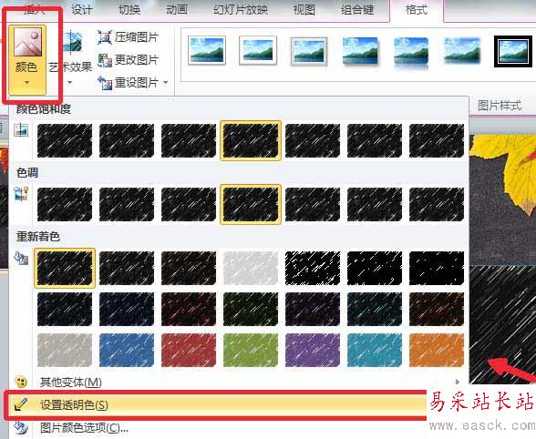 6、“圖片工具”-“顏色”-“設置透明色”設置透明色為黑色。