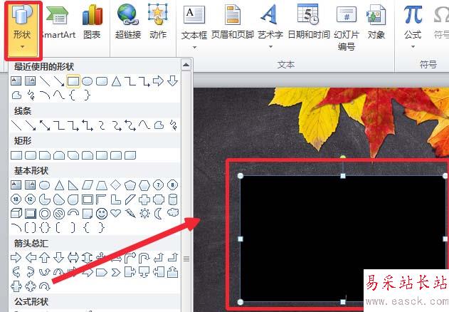 2、首先要制造“粉筆字樣”的素材。在“插入”-“形狀”中繪制形狀,任意形狀均可,填充為黑色。