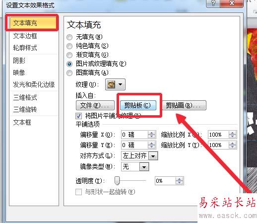 10、“設置文字效果格式”-”文本填充“-”圖片或紋理填充“,插入自”剪貼板“,粉筆效果的字體就完成了。
