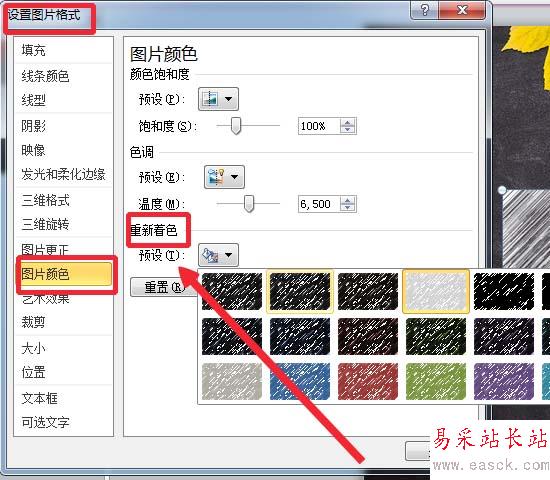 7、在”設置圖片格式“-”圖片顏色“為圖片”重新著色“。