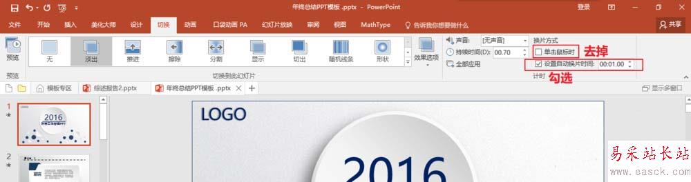 4、接下來切換到【設計】選項卡,首先為幻燈片設置一個切換動畫,然后將“單擊鼠標”換片設置成計時“自動換片”,如圖設置的是該頁幻燈片放映完畢后1s自動切換到下一頁