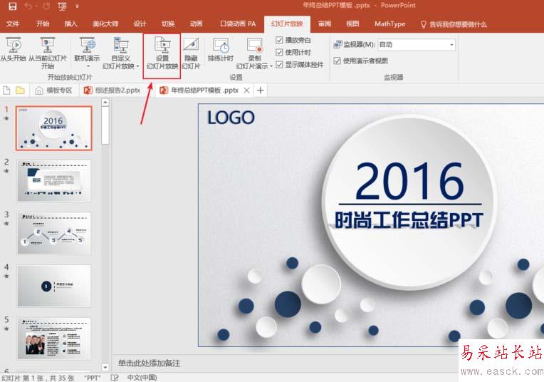 1、首先打開一個PPT,然后將選項卡切換到【幻燈片放映】,在這菜單欄下找到【設置幻燈片放映】選項