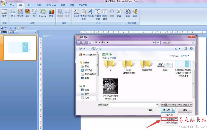 5、在下拉菜單中有“插入、鏈接到文件、插入和鏈接”,在這里我們要選擇“鏈接到文件”,如圖所示。