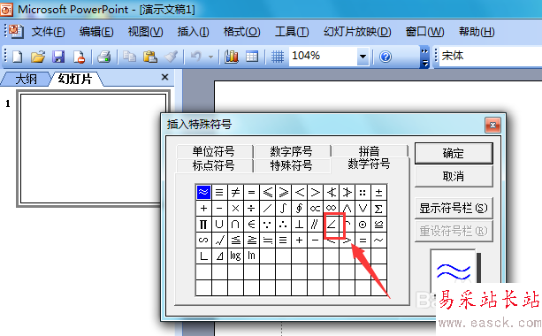 PowerPoint 2003是一款辦公軟件,該軟件在多媒體演示文稿制作方面是非常強大的,我們在使用該軟件指紋演示文稿時,常需要輸入一些特殊的符號和形狀,下面我們就來看看使用該軟件如何輸入角度符號的吧。