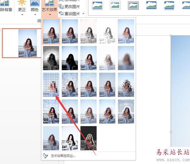 3、在左側點擊藝術效果按鈕,然后在下拉菜單中選擇第三排第一個【淺色屏幕】效果。