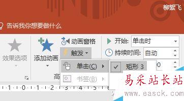 此時灰色矩形旁會多出一個“1”的紅色框,表示它已有一個動畫設置。繼續選中灰色框,然后點擊工具欄上的“觸發”,從彈出框中繼續選擇“單擊→矩形3”,這里的矩形3實際就是藍色框。
