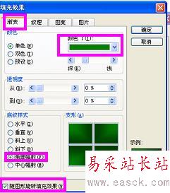 6、顏色選擇好后,設置圖形顏色的填充效果。在填充效果選項卡中,在漸變中,我選擇了單色,角部輻射。