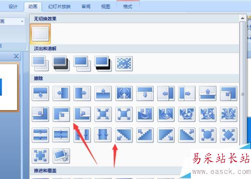 5、在動畫設置界面,點擊右側的動畫效果下拉框按鈕,展示出很多的動畫效果,這提供了大量的圖片切換效果,用戶可以根據自己需要選擇